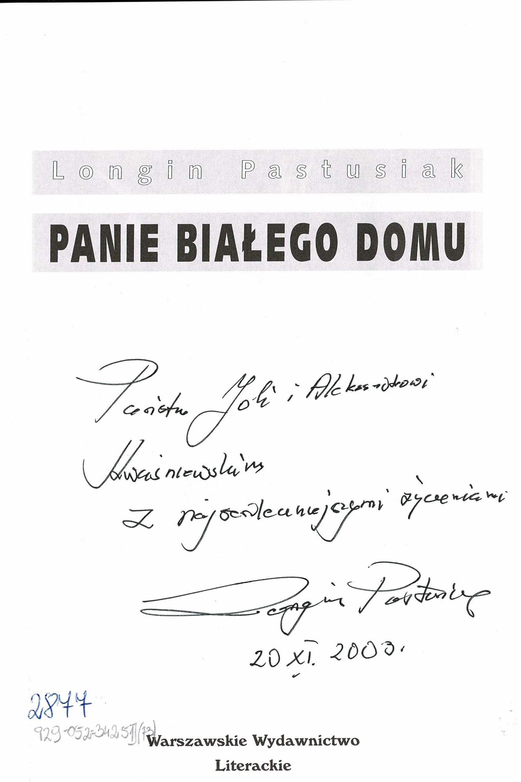 Treść dedykacji: Państwu Joli i Aleksandrowi Kwaśniewskim z najserdeczniejszymi życzeniami