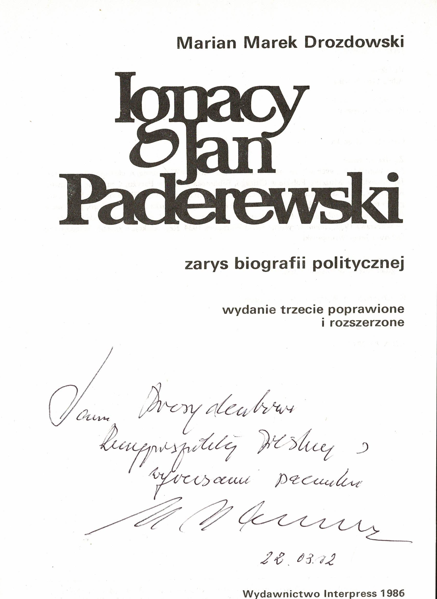 Ignacy Jan Paderewski : zarys biografii politycznej / Marian Marek Drozdowski. - Wydanie 3., poprawione i rozszerzone - Warszawa : Wydawnictwo Interpress, 1986. - 310, [2] strony, [40] stron tablicowych : faks., fotografie, portrety, err. ; 24 cm.
