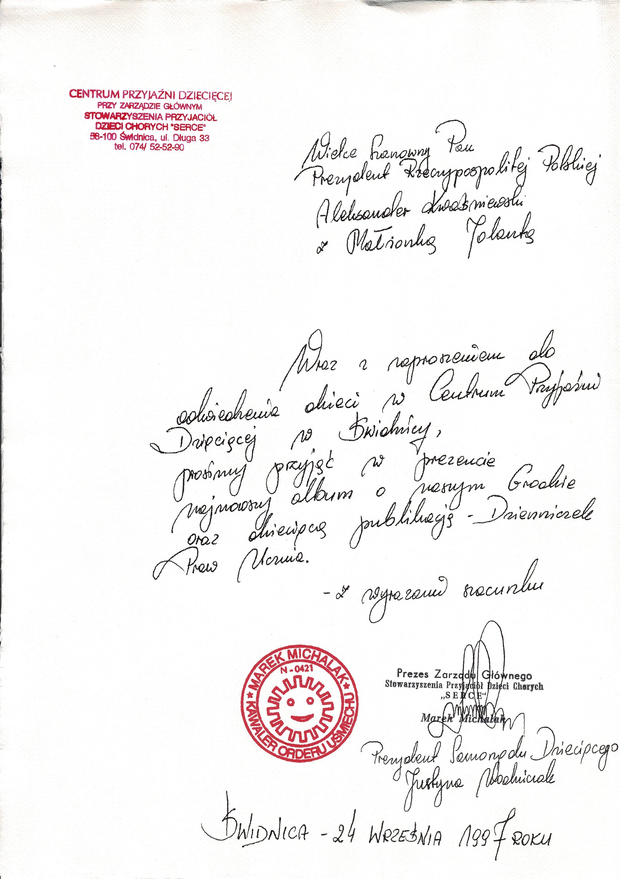 Treść dedykacji: Wielce Szanowny Pan Prezydent Rzeczypospolitej Polskiej Aleksander Kwaśniewski z Małżonką Jolantą Wraz z zaproszeniem do odwiedzenia dzieci w Centrum Przyjaźni Dziecięcej w Świdnicy, prosimy przyjąć w prezencie najnowszy album o nasyzm Grodzie oraz dowcipną publikację - Dzienniczek Praw Ucznia - z wyrazami szscunku Prezydent Samorządu Dzecięcego Justyna Wodniczak Świdnica - 24 września 1997 roku.